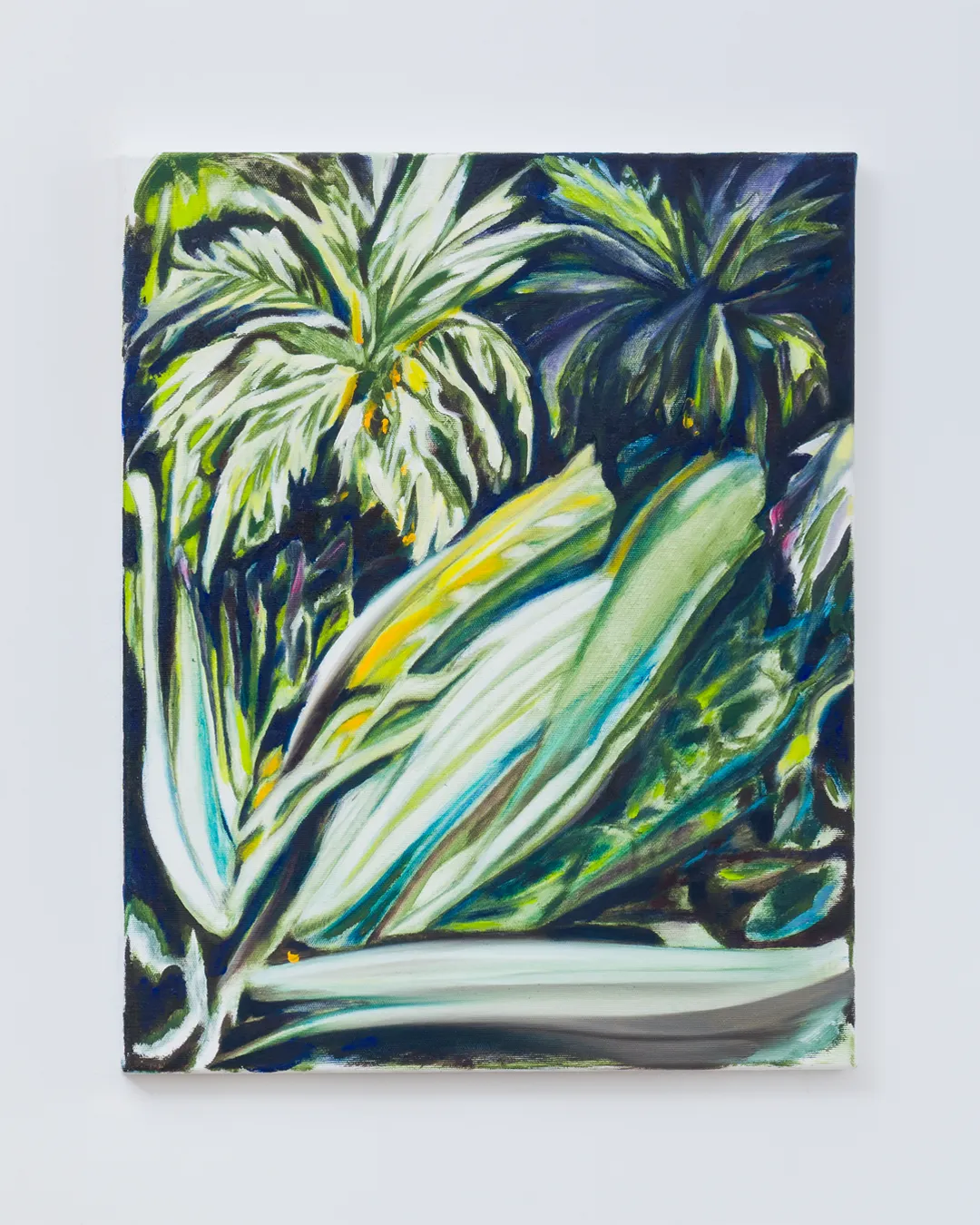 Naomi Pietros (b. 1995, Germany) studied Painting at Burg Giebichenstein University of Art and Design Halle. “Pelican” was created during a residency in Portugal and presents an abstracted object within a dark landscape.