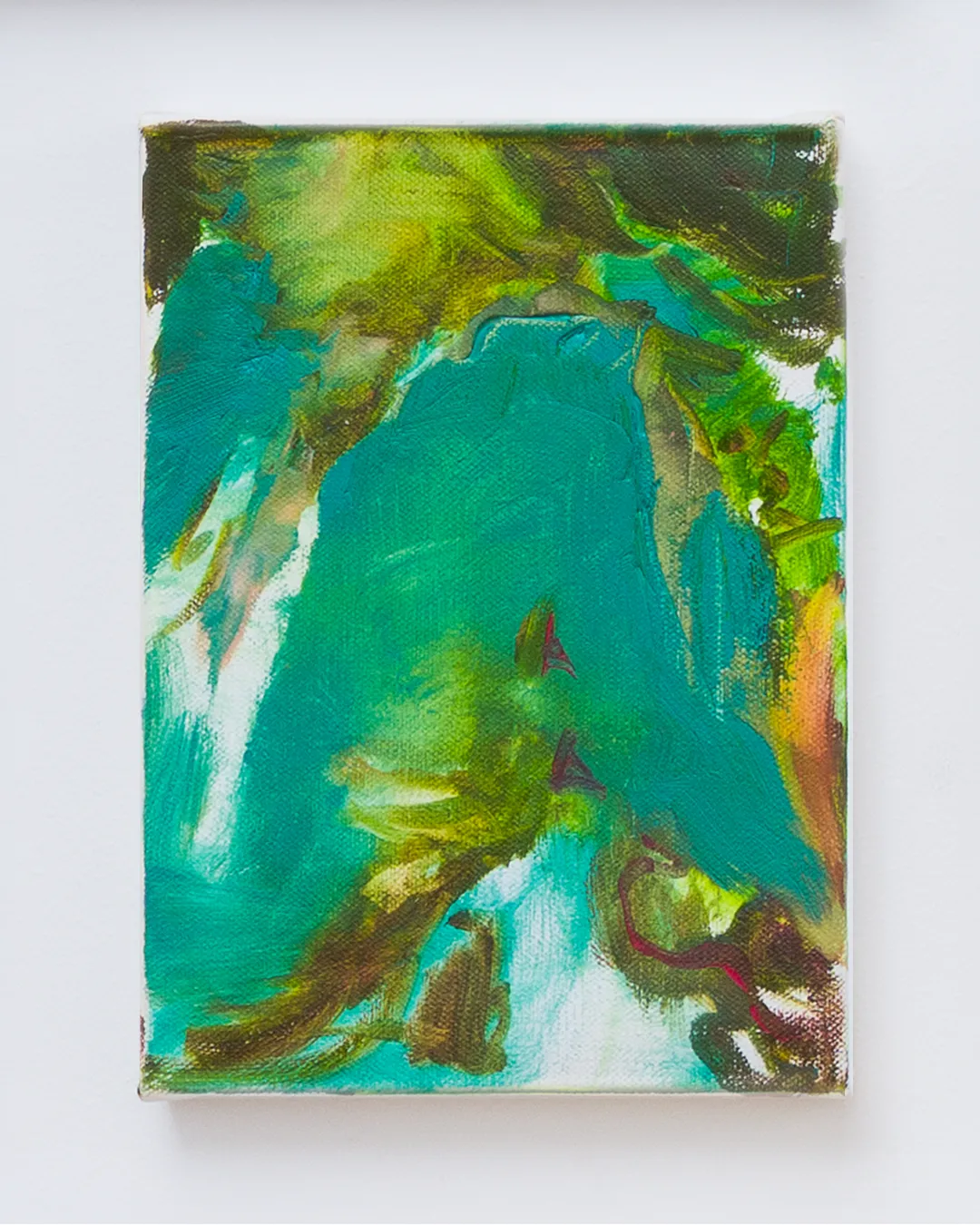 Kyungseo Lee (b. 1995, United Kingdom) studied MA Painting at the Royal College of Art. “Receiving” captures an intimate moment in darkness, saturated in viridian green, playing with opacity and transparency. The artist recently exhibited at Makasiini Contemporary, Finland; Belenius, Sweden; and Galerie Biesenbach, Germany.